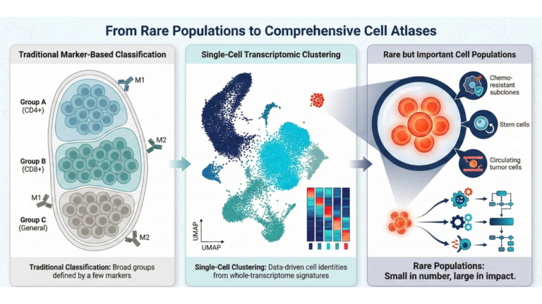 Significantly, the integrity of these new atlases depends on accurate identification of rare cell populations. In complex biological systems, the functional impact often does not correlate directly with population size; rare lineages, such as putative stem cells, circulating tumor cells, or chemo-resistant subclones, usually act as the primary drivers of disease progression despite constituting less than 1% of the tissue mass. scRNA-seq distinguishes these low-frequency events from the background noise, thereby enabling researchers to build a taxonomy that captures not only the predominant structures but also the rare populations that influence biological outcomes.
