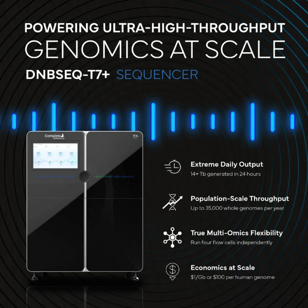 The DNBSEQ-T7+ is the most powerful ultrahigh-throughput sequencer available today. With extreme daily output of over 14 Tb in 24 hours, true multi-omics flexibility through independently controlled flow cells, and economics at scale enabled by DNBSEQ technology, it delivers Q40 accuracy without the tradeoffs typical of other high-throughput platforms.